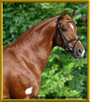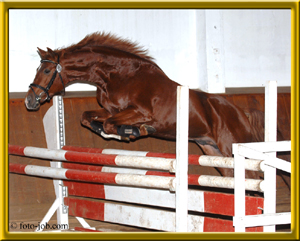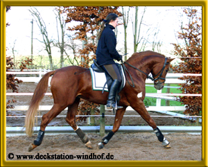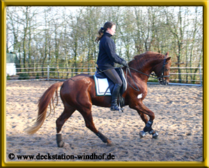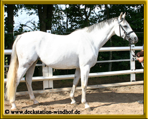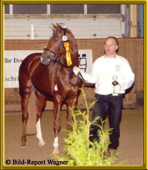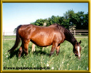 "Diabolos" Mutter "Eileen", aus der "Latona", stark von ihrem Vater, dem Anglo-Araber "Eros" geprägt, ist ein Garant für Bewegungsqualität. Wir setzen sie abwechselnd für die Zucht des kl. dt. Reitpferdes u. des dt. Reitpferdes ein. In 2003 stellte sie mit "Diabolo" den Reservesieger des kl. dt. Reitpferdes auf der Bundesschau in Grasleben, 2006 führte sie ein Hengstfohlen von "Rubin Rouge", das mit einer Gesamtnote von 8,5 aufgenommen und prämiert wurde.  |