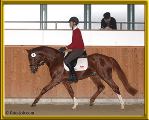 Diabolo überzeugte auf seiner HLP in einem stark besetzten Prüfungslot durch seine erstklassigen Grundgangarten und top Rittigkeitswerte. Im Gelände überzeugte er durch großen Mut und eine ungemein kraftvolle, raumgreifende Bergaufgaloppade. Im Springen zeigte er viel Vermögen und Vorsicht.
