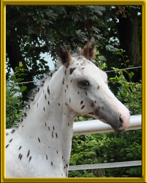 Traumpferd für den Liebhaber des absolut Besonderen! Brauner Volltigerschecke im modernen Knabstrupper Typ stehend mit traumhaft schönem Gesicht und sehr guten Reitpferdepoints. Sehr gute Leistungsgene aus der Mutterlinie über Argentinus, Grannus und Prinz Oldenburg. Großmutter Pandorra brachte u. a. in Anpaarung mit Semper den in Oldenburg gekörten Hengst "Special Desing", der 2002 bei Paul Schockemöhle aufgestellt war. Torero verfügt über einen eleganten Bewegungsablauf mit viel Takt. Sicherlich hochinteressant für die Hengstaufzucht.
